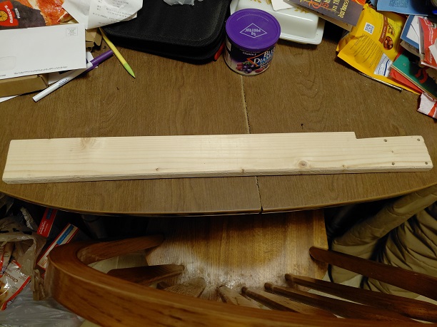 I went to a local Home Depot, and since I didn’t find any suitable scrap wood, purchased an 8-foot 1×3 furring strip for under $3.00. I cut a 2-foot piece off (so I can actually make four of these fake necks). I cut a notch on one end 1/2-inch x 4 inches, so that it would fit snug into the neck slot.