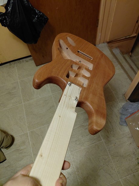 I drilled 1/16-inch holes into the slot section of the board, then for securing the fake neck, I’m using two 6-32×2-inch screws and 6-32 wing nuts. The total cost for this comes to less than $3.00 each for the four that I plan to make (keep two, give the others to fellow kit builders). This will definitely prove to be an extremely useful tool when staining and finishing bolt-on guitar bodies. Since I’ll be using Tru-Oil on this next project, I can do all of the work indoors, as Tru-Oil doesn’t have nasty fumes.